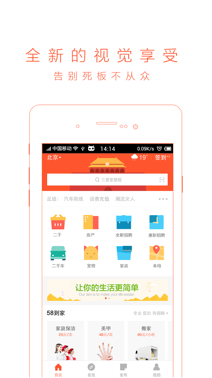 GPS定位,周边生活信息一网打尽;一键转发信息打电话很方便;二手车买卖;家政清洁;电影票;航班、列车查询;旅游线路;酒店预定;签证等。用58同城生活更美好!