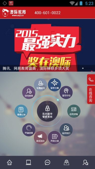 留学规划阶段,产品开发了留学进程查询系统,全面立体跟踪你的留学进程,一键答疑功能为您答疑解惑,国际游学可在线体验真实的游学历程、游学心得提供全面而丰富的出国学习体验,在开拓视野的同时,帮助学子确定出国留学意愿;在留学历练阶段,国际预科和澳际留学英语学校可以帮助学子打造坚实的语言基础实现在线选课上百种个性化课程可供选择,在线预约雅思、托福名师。完善的“澳际生态链”服务模式,帮助学子成就留学生涯。