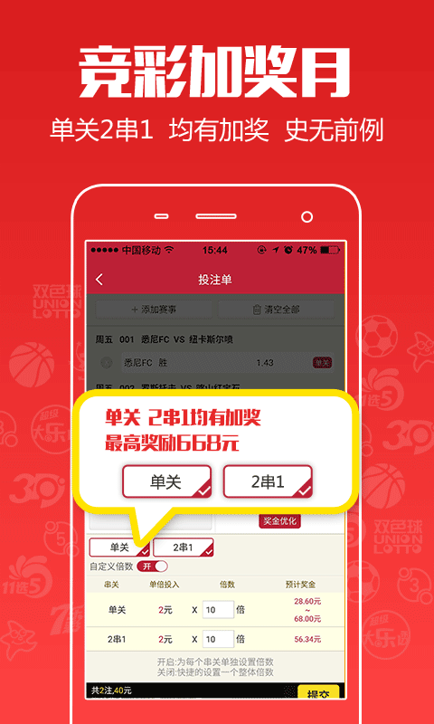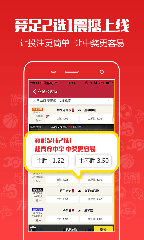◆竞彩新玩法(触屏版):竞彩足球单选赔率区间在1.75以上的比赛,3场比赛2串1的过关方式,降低投注风险,也可保证较高奖金回报。