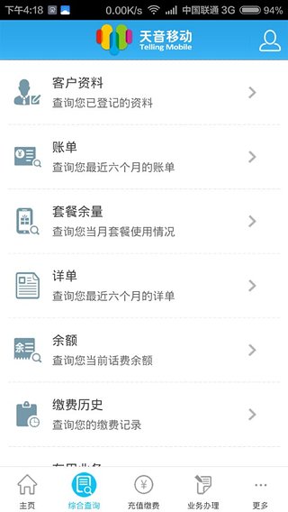 1、综合查询,您可实时查询账单、余额、套餐余量、详单、缴费历史、在用业务。