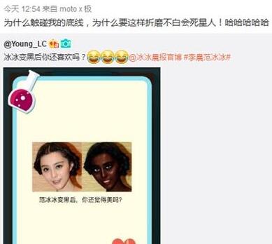 范冰冰遭恶搞黑人变脸软件是最新出现的恶搞P图软件,范冰冰范爷一直是以白瓷美肤的形象出现在大众面前的,而有一天范爷要是变黑了,你会接受得了吗?