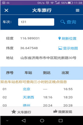 今后还会增加更多功能,服务您的火车旅行。 输入您乘坐的火车车次,查询旅途各站到发时刻信息,双击车站名可得到预计或实际三小时的正晚点信息。