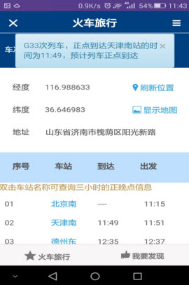 点击显示地图可直观查看您当前在铁路把图的位置,这需要您允许使用您的手机位置信息,由于对位置精度要求不高,用手机基站定位(可不开GPS)即可。 希望您喜欢火车旅行APP。