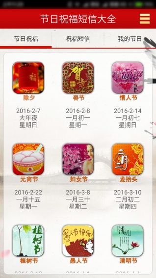 节日祝福短信大全是一款手机短信祝福语大全软件,节日祝福短信大全通过短信微信等应用给发送节日祝福给家人和朋友,还可以通过分享功能分享到其他途径传播祝福信息。