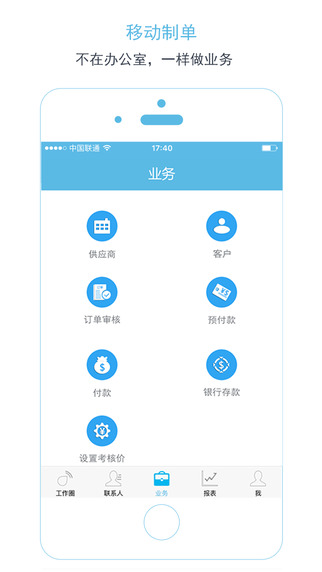 4.移动制单:订单审核、考核设定、银行存款、往来查询,不在办公室,一样做业务;