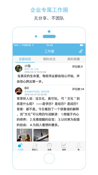 3.企业内部工作圈:与同事们分享工作、观点、知识,用最少的时间知道公司的大小事情;
