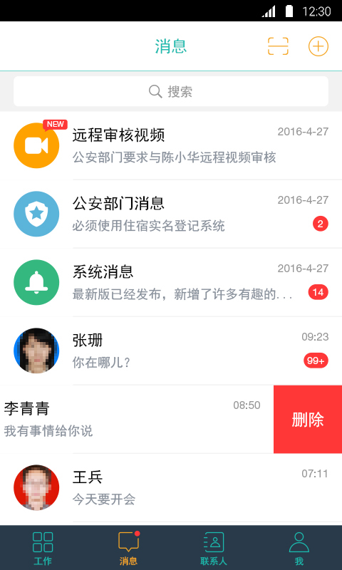即时通讯功能——添加使用该系统的其他人员,实现酒店间的快捷交流。