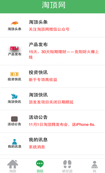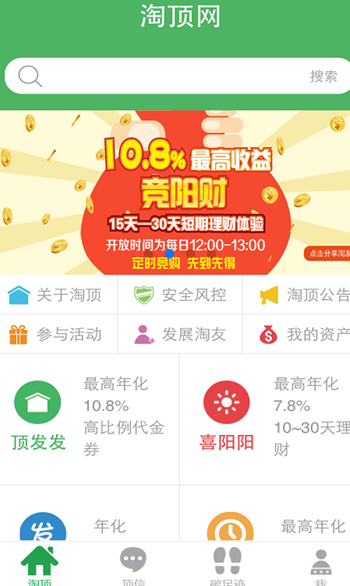 淘顶网官网app是以分布式光伏电站为主的垂直一体化产融结合型互联网平台,于2015年9月20日上线运营,年内将发布超过30个众筹产品,为多家金融机构提供优质的资产包,是“大众创新、万众创业、万民创富”分享新能源发展红利的光伏电站资产包供需一体化解决方案生态型互联网平台,欢迎大家下载使用!