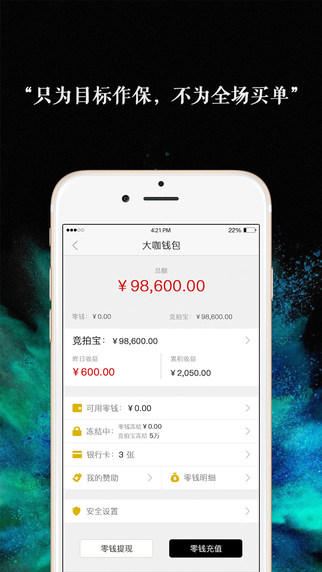 大咖钱包/我们为您打造艺术行业的“支付宝”,不必为临时充保证金着急,点击参拍自动冻结金额,拍卖结束立刻释放到钱包。增加全新“竞拍宝”功能,不仅能竞拍,转到“竞拍宝”还可获得理财收益;