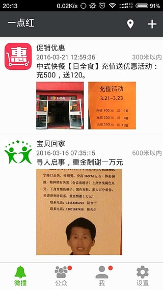 - 可以用微播告诉大家附近的通知、招聘、优惠、寻物、活动等信息
