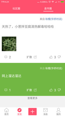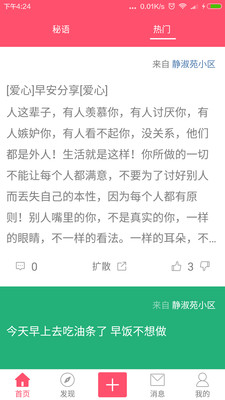 社交内容,有两个特点,一是匿名;二是基于小区或村庄,每个人可以看到自己注册地址周边五个小区或村庄的人发布的内容。