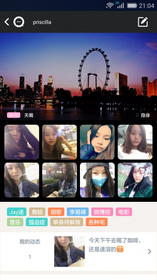 个人资料:丰富的个人资料从此可以全方位了解你的心仪的TA, 美衣美食高颜值,美文美图秀恩爱,清新萝莉么么哒,