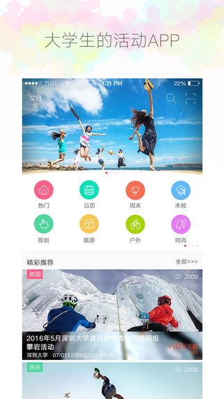 为大学生提供更简单、方便、快捷的各类活动发布、报名、宣传、票券等管理和支付服务。可以发起或参加包括包括培训、考试、考证、兼职、实习、就业、创业、交友、金融、校园购物、二手市场、旅游、留学等各类精彩活动。为大学生提供更多丰富的学习、娱乐、以及兼职、实习等社会实践机会,认识更多同校、同城大学生朋友,扩大交际圈。