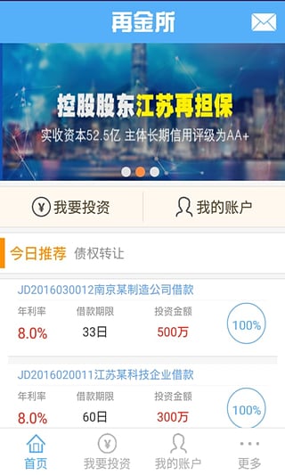 再金所APP是由国资金融企业江苏再保推出的一款移动互联网金融平台。再金所依托江苏再担保资信与资源优势,在不断健全、规范风险管控体系的基础上,安全、便捷、灵活、稳健地为借款人和出借人提供信息发布、交易撮合等金融信息服务,为全省中小微企业引入网络金融理念,拓宽融资渠道,缓解融资难题,同时满足广大理性投资者财富稳健增值的投资需求,用心打造服务于中小微企业的互联网金融服务平台。
