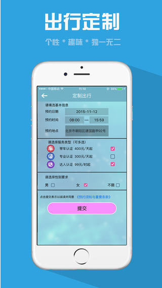 2.定制出行 个性定制服务类型,雷达选人为您快速筛选您需要的服务,为您带来更优质的旅行体验。个性有趣味的功能,独一无二。