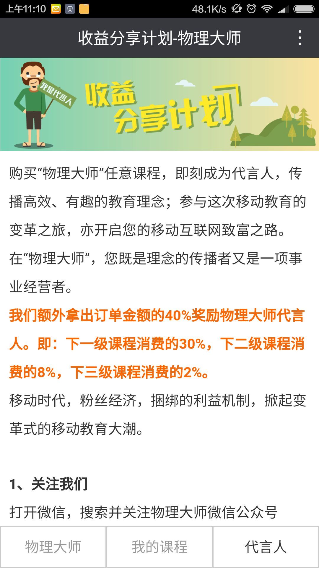 3、代言人计划:购买物理大师任意课程,即刻成为代言人,传播高效、有趣的教育理念;参与这次移动教育的变革之旅,亦有丰厚回报哦~