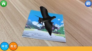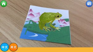 1.AR模式,点击主菜单的“开始”按钮,通过摄像头扫描实体图片,相应的3D动物会牢牢的出现在图片上,点击屏幕上的3D动物实现互动,中英文发音学习动物名称。