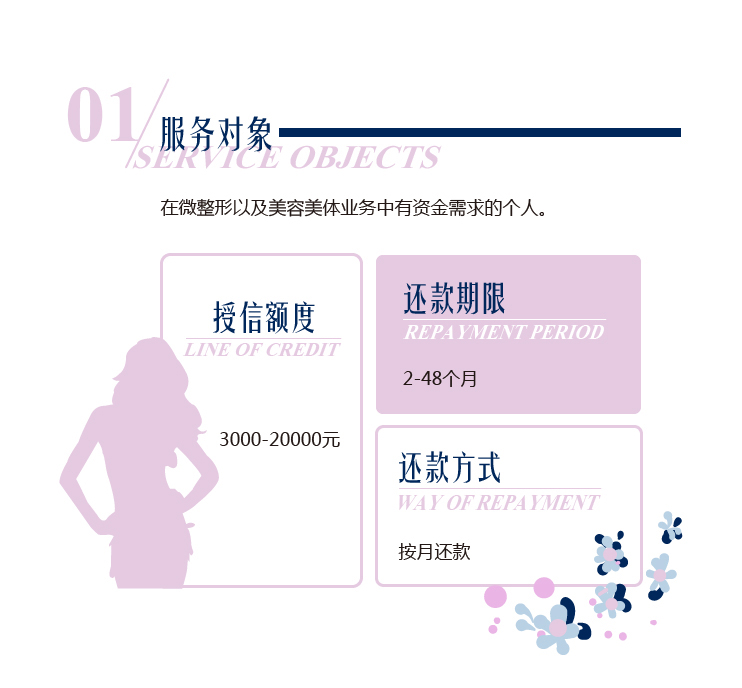 1.该产品致力于服务在微整形以及美容美体服务中有资金借贷需求的个人,为其提供优质高效的消费借款分期服务。