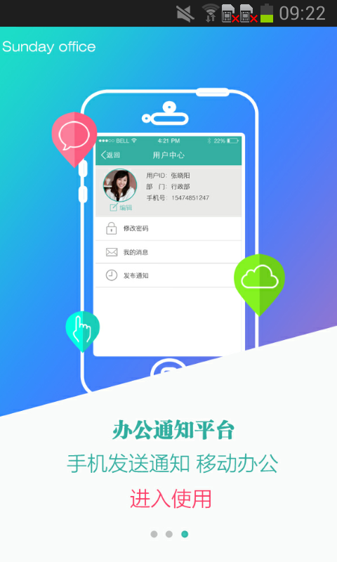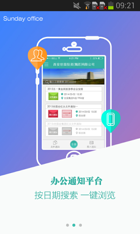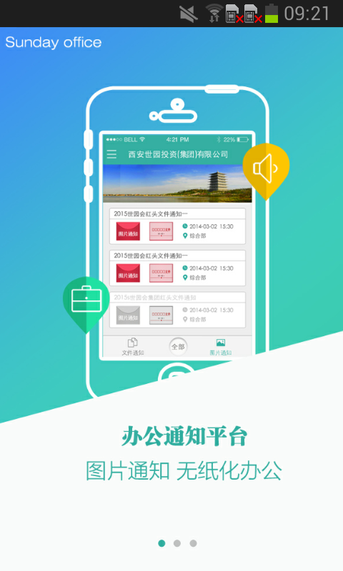 世园集团app,单位内部APP客户端办公通知平台,客户端设计直观简洁,功能分布一目了然,轻松实现无纸化办公,便捷高效更环保;文件通知、图片通知一键发送,个人中心等功能一应俱全,管理员实时接收通知浏览情况反馈,一切尽在掌握。