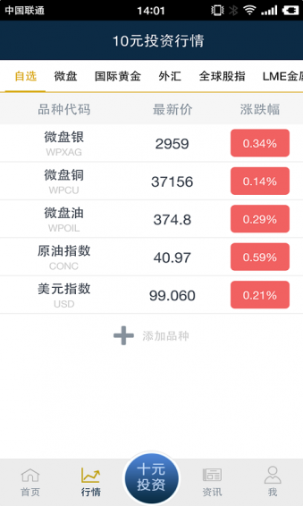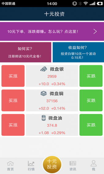 1、10元投资移动应用内嵌目前潮流市场的微盘栏目,以原油、铜、白银为投资标的,10元、20元、200元都可以投资。