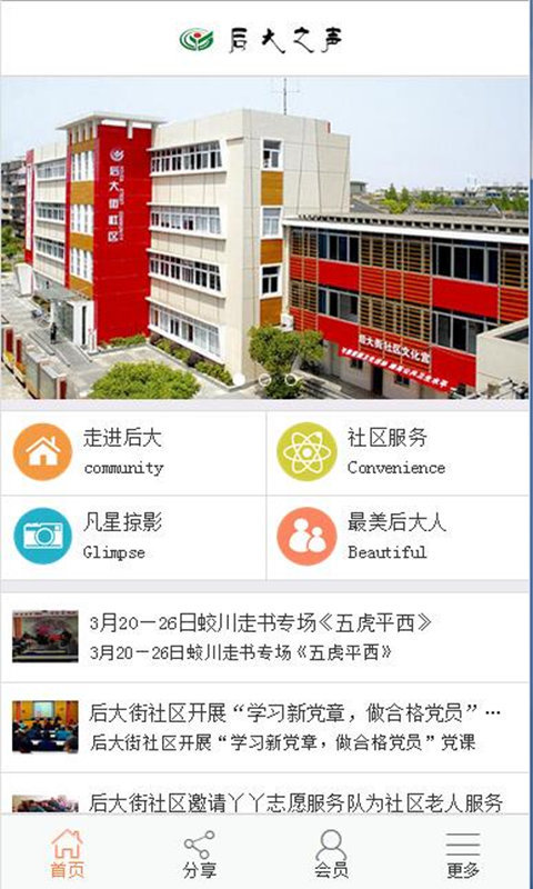 欢迎下载安装后大之声手机客户端,通过这个客户端,您能了解到后大之声的各类信息,如后大社区、社区动态、社区服务等。同时,为方便推广,还提供二维码、分享等功能,感谢您的支持!