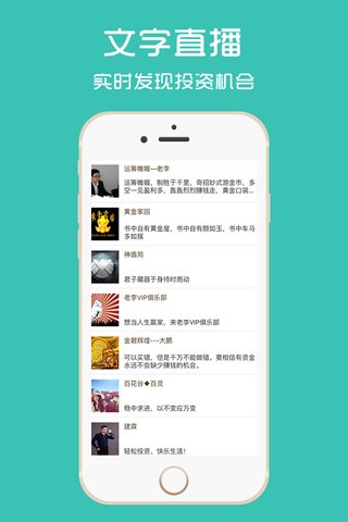 功能介绍 开户交易:3分钟手机免费开户 24小时直播室:各路精英分析师轮番坐阵,第一时间给您盈利机会 一对一私人客服:聊行情,教看盘,解问题,发策略 精选资讯:海量专业资讯,股市热点,机会情报,板块概念 开放平台:任何用户都可以和分析师互动,向分析师问行情问策略 财经日历:全球重大事件圈掌握