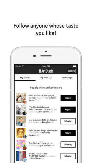 艺堆是一款免费的艺术品社交平台,关注你喜爱的人们和艺术家,以看到相关和具启发性的艺术品和评论。无论是在艺堆还是在互联网,当你看到你喜欢的东西时,你可轻易地把它们添加到你的艺堆-你的个人艺术收藏系列。