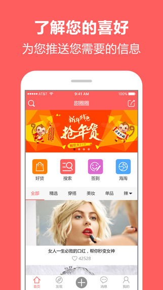 甜圈圈是一款专门为女性打造的手机软件,为女性用户挑选了优质的产品,在这里可以找到所有你想要,省去了到处搜索的麻烦,有需要的朋友赶快来下载吧!