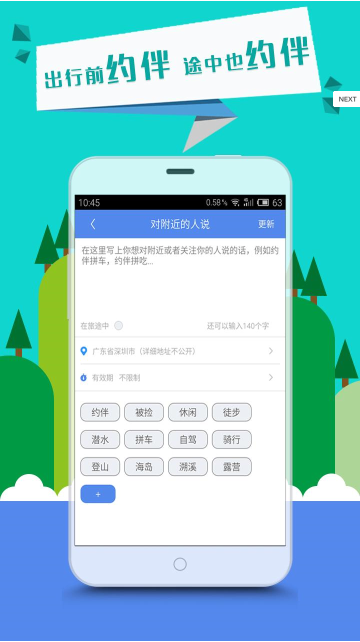 时常更新状态,让朋友、附近的人知道你最近想去哪玩,说不定他们也有兴趣加入到你的行程中,让旅途更有趣。也可以通过途聚知道自己生活的地方附近有什么好玩的地儿。