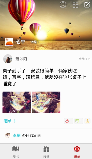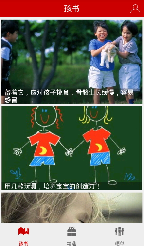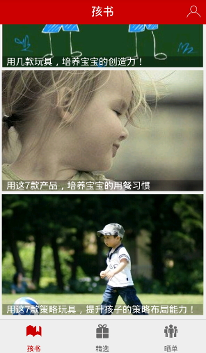 孩书app是一款儿童用品购物平台,在这里有着各类儿童用品,没有你找不到,只有你想不到,为每一个家庭,每一个父母准备最好的礼物,为了孩子的健康成长,孩书所有商品都由正规渠道进货,质量安全有保障,绝对环保。