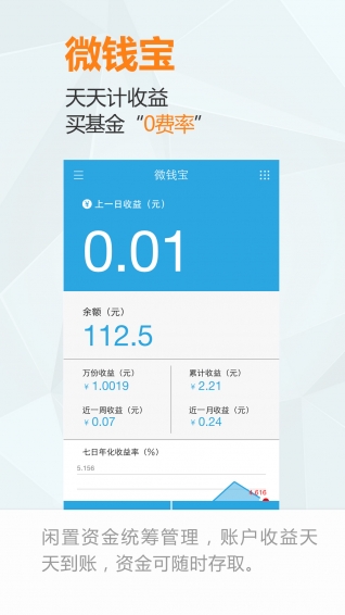 4、微钱宝:闲置资金统筹管理,账户收益天天到账,资金可随时存取。