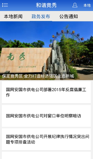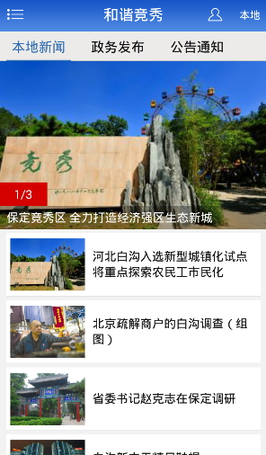 和谐竞秀app是一款地区新闻资讯平台,竞秀区在河北保定市,这座历史名城在新时代重新绽放着光彩,和谐竞秀为大家推送本地的各类大事小闻,城市发展的相关动态,包含道路交通、医疗教育等领域,宣扬保定市的新风貌。