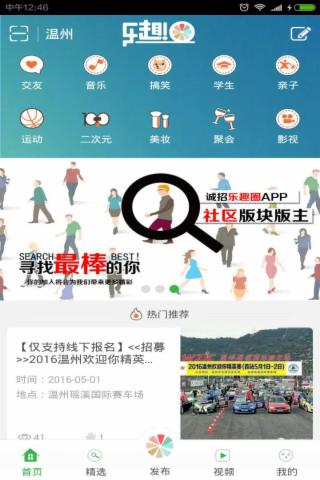 免费为用户提供活动发布、管理等服务 用户可进行视频上传、分享;帖子发布、分享 更有乐趣圈举办的赛事和活动,丰富大奖等你来拿哦!