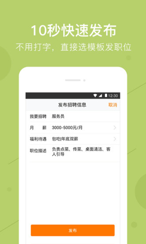 1.10秒发布职位——想招个服务员,职位描述怎么写?不用你动手,我有覆盖全行业的个性化模板,选中发布,10秒搞定;