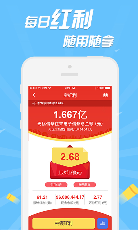 3.每日红利,随用随拿,咻得一下红利就能装进钱包!