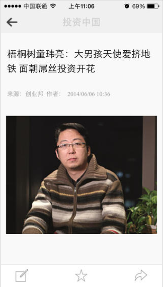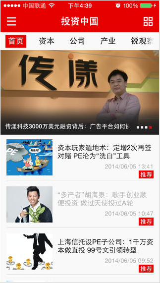 “投资中国”是一款面向广大投资人和创业者的新闻资讯应用,专注于一级市场投资新闻、报道、报告和数据等信息的展示。内容来自“投资中国网”(www.chinaventure.com.cn),“投资中国网”是中国第一股权投资门户网站。