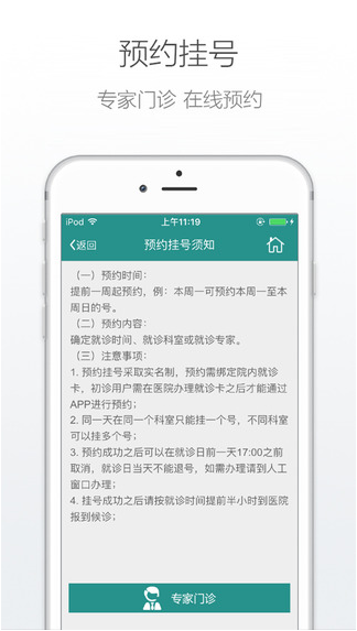 【预约挂号】提供本院全部科室专家门诊的预约挂号功能,患者只需一部手机,即可完成预约挂号,并且随时随地可以查看叫号情况。
