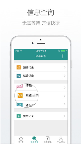 【信息查询】患者可以通过客户端轻松查阅自己的体检、检验检查报告单,免去了用户往返医院带来的不便。