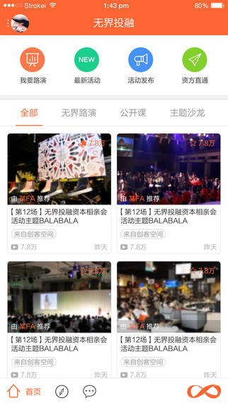 无界投融移动端的上线,使投融更简便和高效。我们将项目方、投资人和创客空间汇聚在同一个平台,他们通过无界投融应用进行基本社交,并能发起活动、发起路演,更能直通资方。