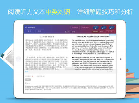 Practice功能:阅读听力文本中英文对照翻译;详尽的答题思路和解析;听力题截取对应原文及音频反复精听