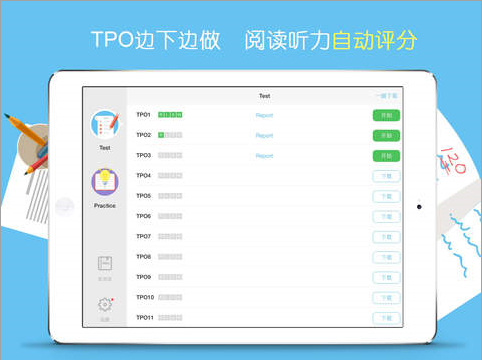 Test支持续做功能:没有整块时间完整的做一套TPO?没关系,我们自动帮你记录上次答题状态,让你时刻回到测试状态,完整做完整套TPO