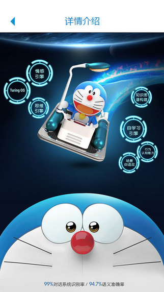 1、蓝光机器人——机器猫具有“情感计算引擎”; 2、蓝光机器人——机器猫具有“思维强化引擎”; 3、蓝光机器人——机器猫具有“自学习引擎”; 4、蓝光机器人——机器猫具有“儿童对话功能”; 5、机器猫具有五大家庭场景应用:休闲娱乐,知识学习,英语教育,操作控制,实用工具,适用不同场景的对话应用