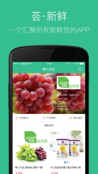 1.0版本从新鲜、健康的源头开始,推出澳洲鲜果、澳洲直邮商品套餐,支持支付宝付款。