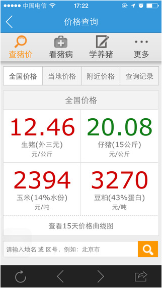 2.价格查询:实时快捷查询你所在区域的猪价、玉米价、豆粕价,直接自动定位,无需复杂操作。