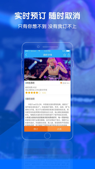 【在线即时预订】用户可通过本平台在线预定位置、酒水套餐和酒水单点,更可以及时了解店内台位、包房空置率和演艺活动信息。