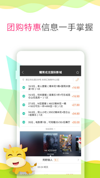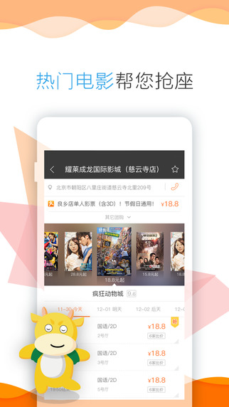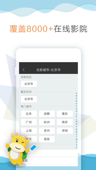 【便捷的影院搜索】拥有您去过的电影院(曾经购买过电影票的影院,电影院收藏)功能,让您的购买电影票过程更加人性化,更加便捷。