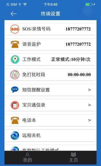 5.设置: APP 可以设置 SOS/亲情号码,设备工作模式,监护号码, 免打扰模式等优化轨迹,地图
