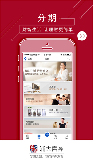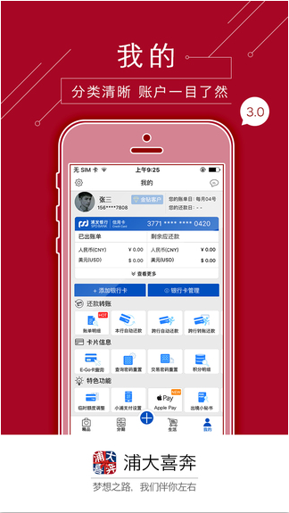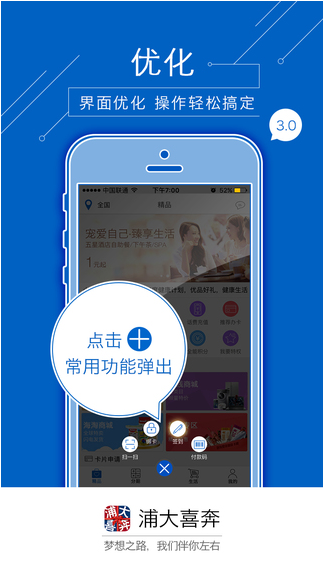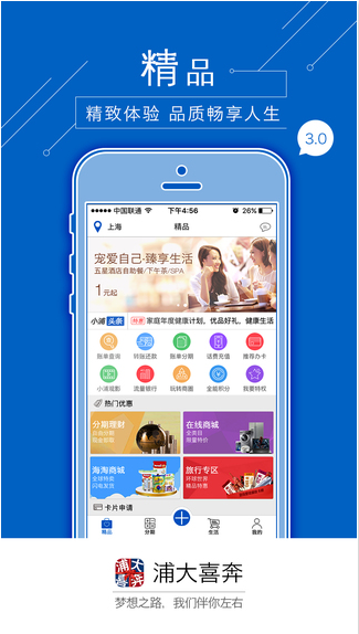 浦大喜奔app是由浦发银行推出的一款金融服务软件。为用户提供了便捷的银行账户查询、手机在线还款、信用卡申请、商城购物等功能,用户可以在线进行话费充值、购物等服务。本软件还为用户精选了丰富的理财项目资源,方便你随时随地在线理财。是浦发用户手机必备的金融服务工具。欢迎用户下载体验。