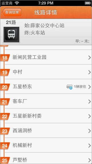 站点查询是以乘车站为中心,查询经过该站的所有线路及方向列表,用户选择线路及方向后,即可查询到经过该乘车站的最近一辆车的实时信息。