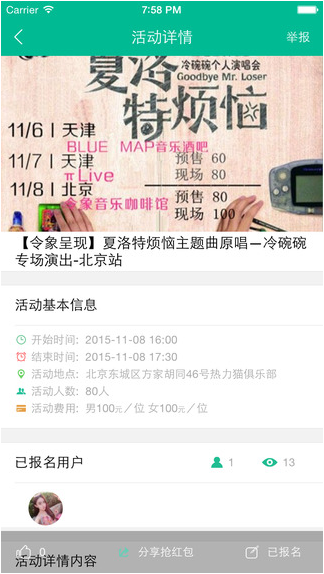 发布:在聚咖平台,用户可以自主发布、管理、删除活动。并查看报名用户的手机、 缴费金额等基本信息。